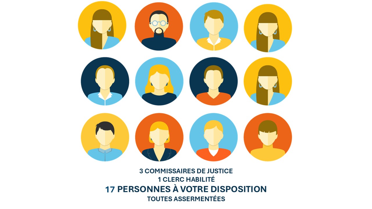 Notre étude est animée et portée par une équipe de 17 personnes qui ont à l’esprit d’être utiles et efficaces. Nous sommes conscients de notre mission de service public et veillons à servir les justiciables lorsqu’ils nous sollicitent. Dans ce cadre, nous souhaitons être les plus adaptés possible aux demandes de nos clients. L’héritage rassurant dont bénéficie notre profession ne nous empêche pas de répondre avec modernité à nos clients. Les moyens techniques actuels nous permettent d’être plus réactifs, plus rapides et encore plus complets : vidéo, échanges dématérialisés et sécurisés.